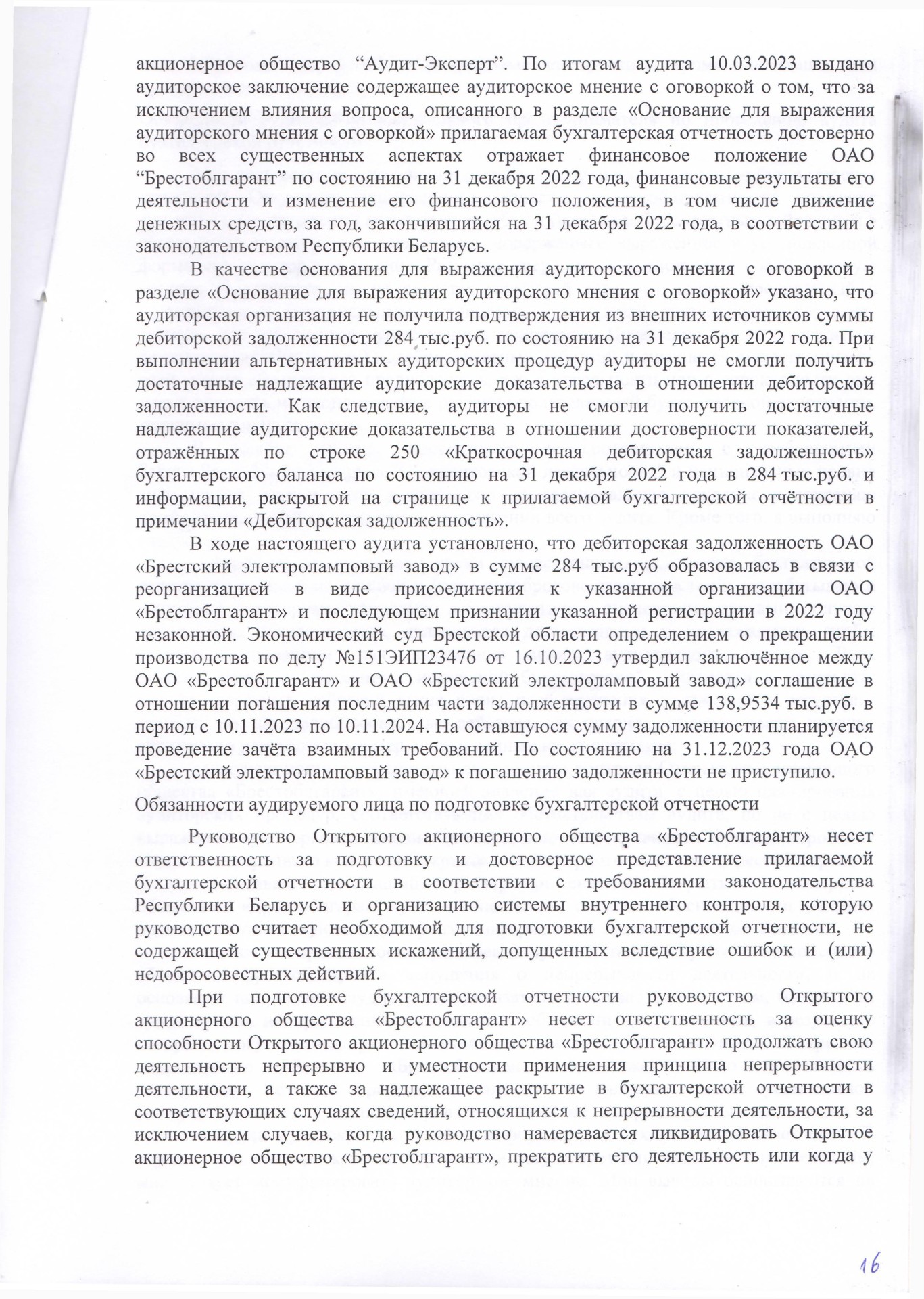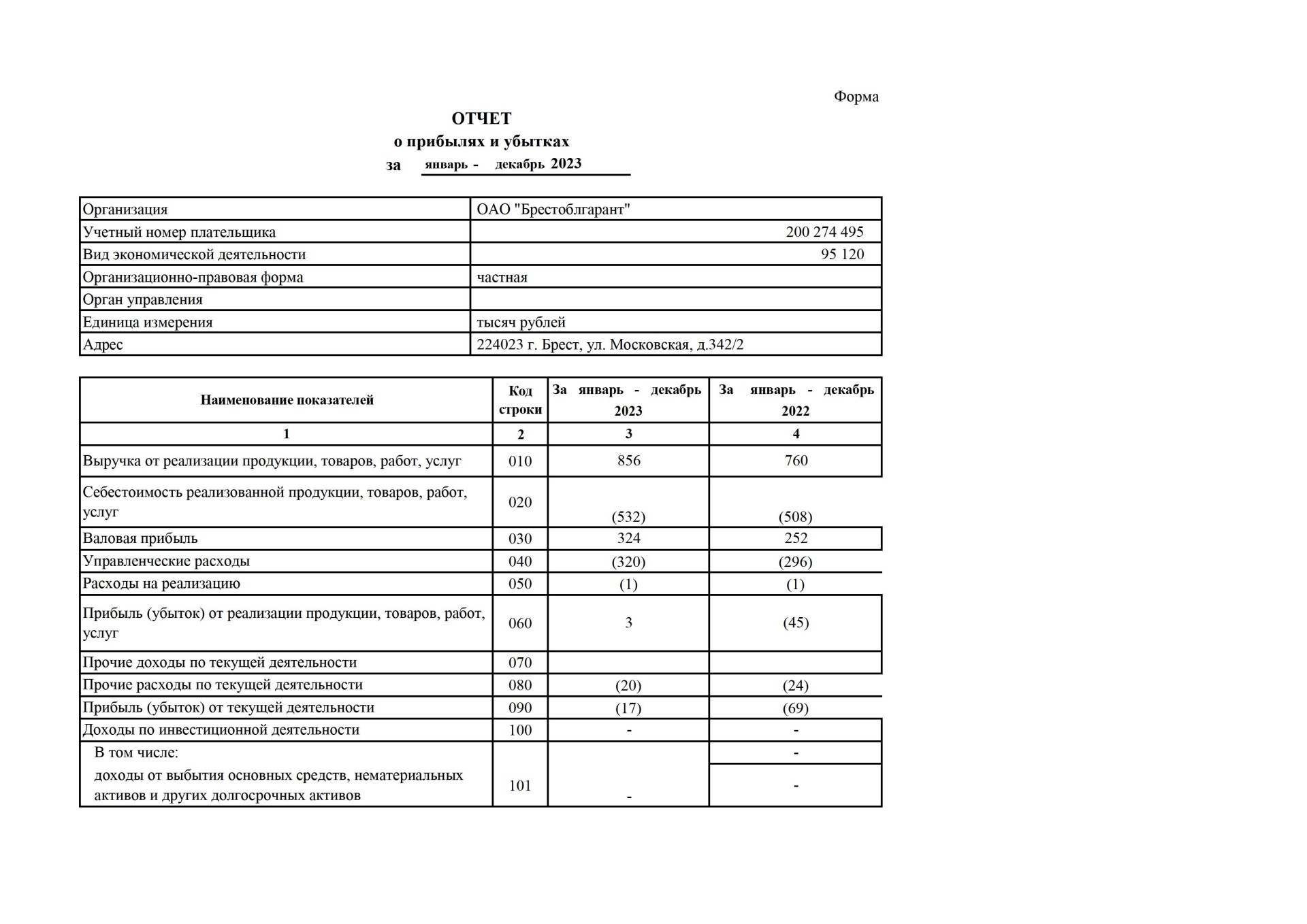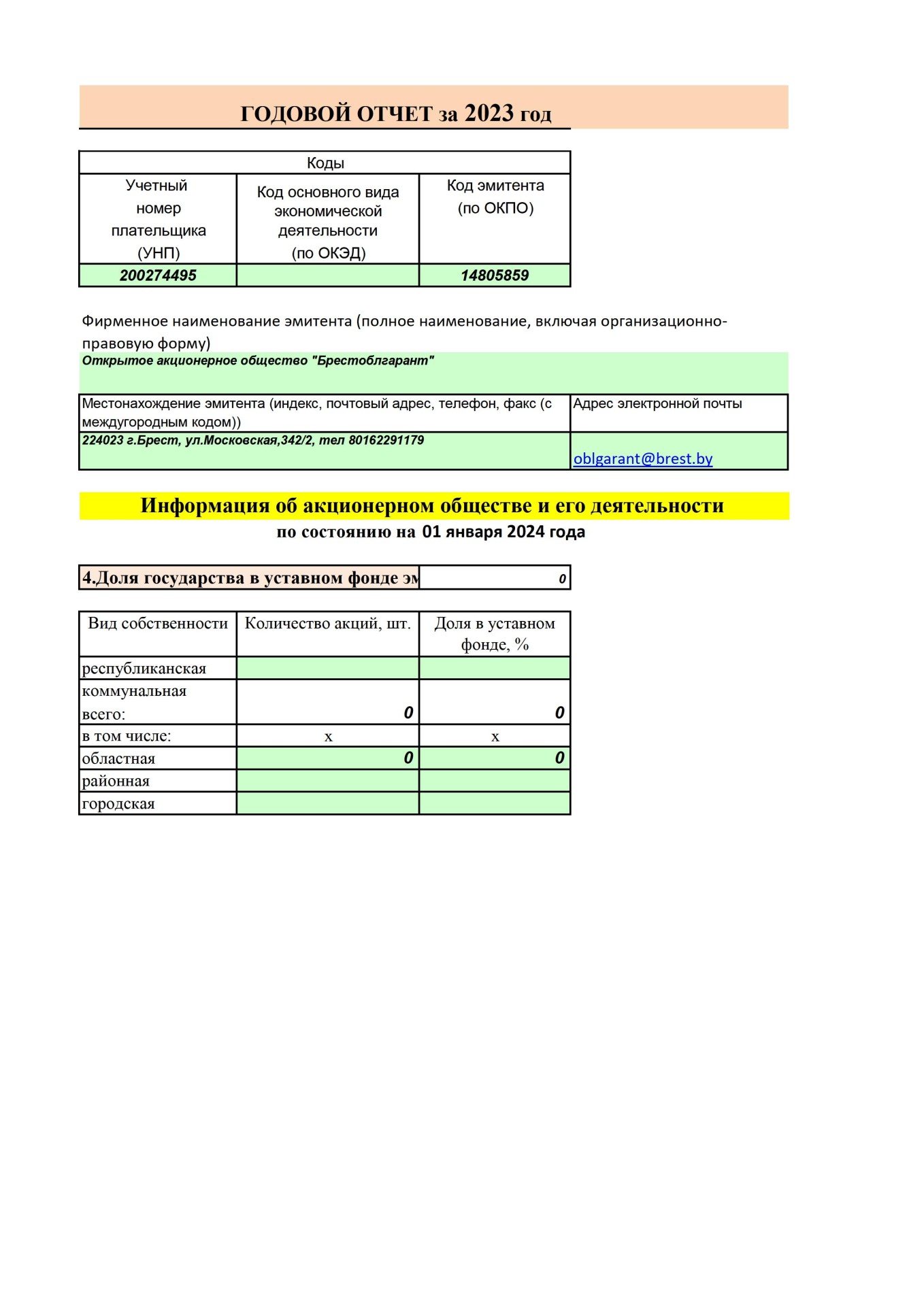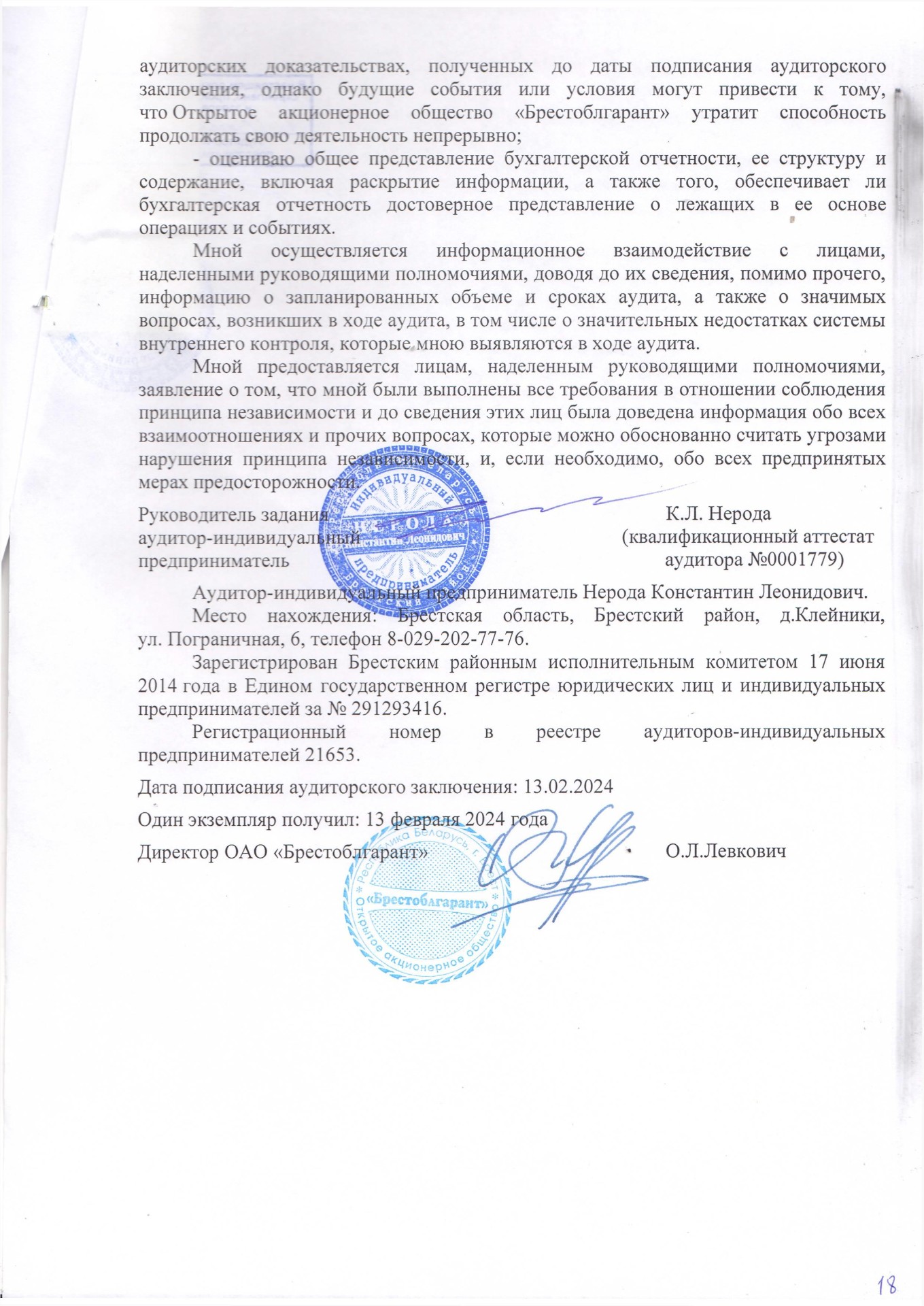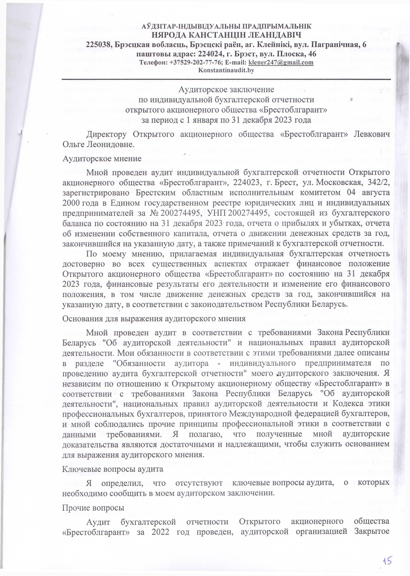 Аудиторское заключение по индивидуальной бухгалтерской отчетности открытого акционерного общества «Брестоблгарант» за период с 1 января по 31 декабря 2023 года