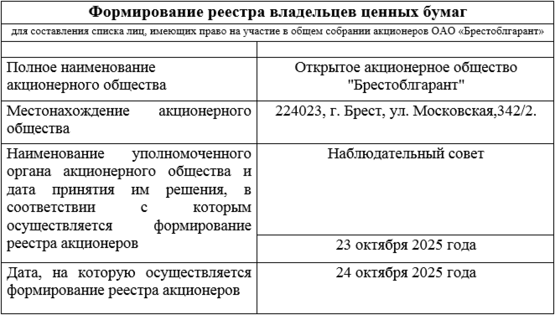 Открытое акционерное общество «Брестоблгарант» (далее по тексту – Общество), расположенное по адресу: г. Брест, ул. Московская, 342/2, приглашает Вас принять участие во внеочередном общем собрании акционеров Общества (далее – Собрание Общества)